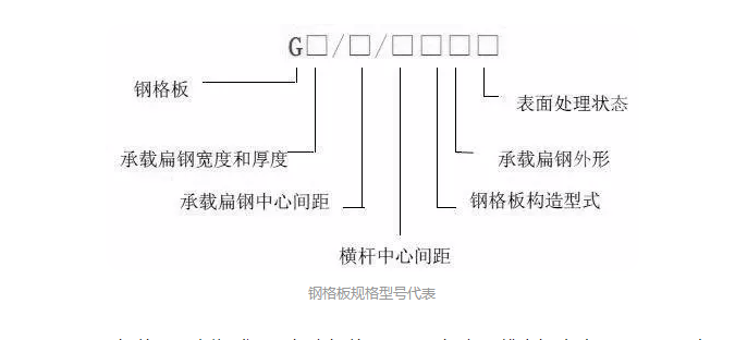 G253/30/50鋼格板最新標(biāo)準(zhǔn):G代表鋼格板;253代表承載扁鋼寬度25mm,厚度3mm;承載扁鋼間距30mm,橫桿50mm;扁鋼構(gòu)造形式W代表壓焊(在標(biāo)記中可省略),L代表壓鎖(也就是我們常說的插接鋼格板);承載扁鋼外型F代表平面型扁鋼(可省略),I代表I型鋼,S代表齒形扁鋼;表面處理狀態(tài)G代表熱鍍鋅,P代表涂漆,U代表表面不處理